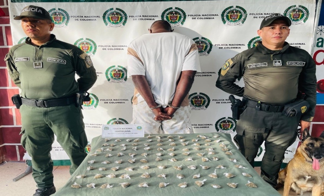 Durante los controles, el canino ‘Killer’ realizó una señal positiva sobre un recipiente transparente, en cuyo interior se hallaron 96 bolsas de marihuana, con un peso superior a 130 gramos. El sujeto capturado, conocido como ‘Lucho’, de 44 años y natural de Cartagena, fue dejado a disposición de la Fiscalía General de la Nación, a la espera de las audiencias preliminares que definirán su situación judicial.