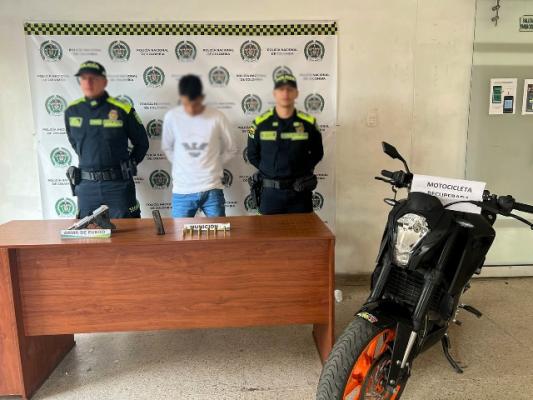 En la huida, este hombre, al parecer, arroja un arma de fuego; la cual es encontrada posteriormente, por nuestros uniformados, resultando ser una pistola, calibre 9 mm, con una adaptación para la ubicación de un supresor de sonido, y de igual manera 16 cartuchos para la misma. A su vez, se le incauta la motocicleta, avaluada en $18 millones de pesos; ya que esta, fue hurtada, mediante halado, en la ciudad de Pereira, el año inmediatamente anterior.