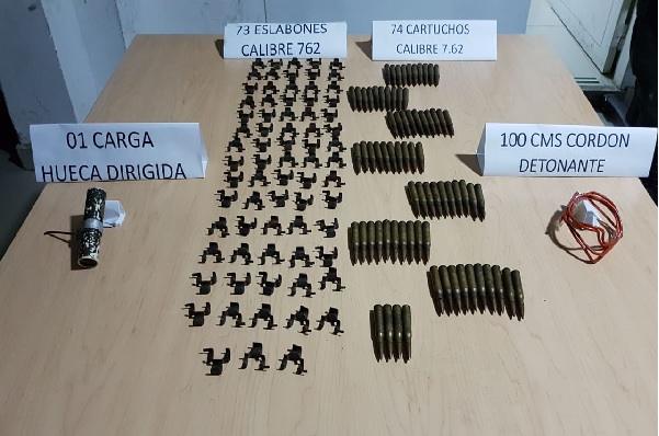 Con una carga explosiva dirigida, 74 cartuchos calibre 7.62 mm, eslabones para cartuchos de la misma clase y 01 metro de cordón detonante fue capturado en las últimas horas del Frente Juan Fernando Porras Martínez’ un subversivo del ELN conocido como “Caracas”, las investigaciones de la Seccional de Inteligencia Investigación Criminal revelan que este sujeto estaría transportando material bélico, apoyo logístico a ese grupo guerrillero dentro del casco urbano y realizando actividades de inteligencia delictiva para atacar a la fuerza pública.