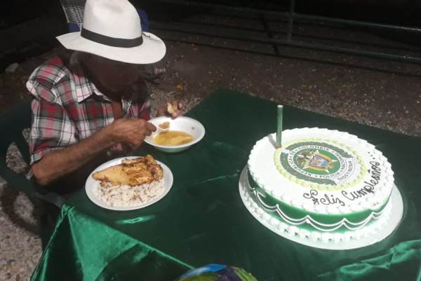 Don Luis fue llevado hasta la mesa, al lado de su esposa, vecinos y policías, a disfrutar de los manjares, cuando el sonido de las trompetas anunció a los mariachis, quienes llegaron cantando las mañanitas y después complacieron al cumplimentado con sus canciones favoritas.