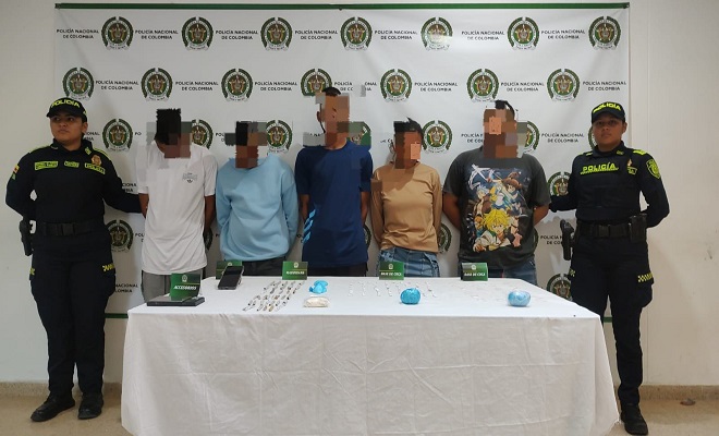 Como resultado de labores investigativas, se llevaron a cabo seis diligencias de registro y allanamiento simultáneas en los barrios La Invasión, El Bronx y San Jorge de Ponedera. Este operativo permitió la captura en flagrancia de cinco personas, cuatro hombres y una mujer, por el delito de tráfico, fabricación o porte de estupefacientes.