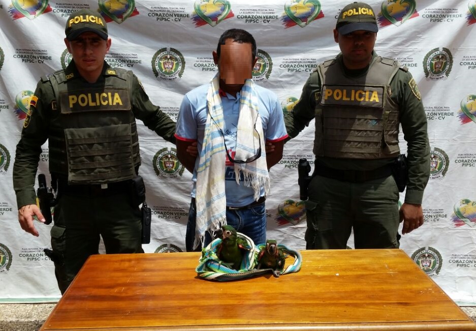 La primera captura fue realizada por policiales adscritos a la Estación de Policía San José de Uré, cuando adelantaba actividades de patrullaje en la vía que comunica el municipio de con el Tarazá, en las inmediaciones a la entrada a la vereda el porvenir, efectuaron la captura en flagrancia de un hombre de 34 años de edad, el cual al momento de realizar un registro a persona, se le encontró en su poder una mochila de color verde y blanco la cual al ser revisada se encontró dos aves de nombre común guacamaya cheja avaluadas en aproximadamente en tres millones de pesos, el capturado fue dejado a disposición de la fiscalía en turno, mientras que el ave fue entregada a las autoridades ambientales para ser liberada en su hábitat natural.