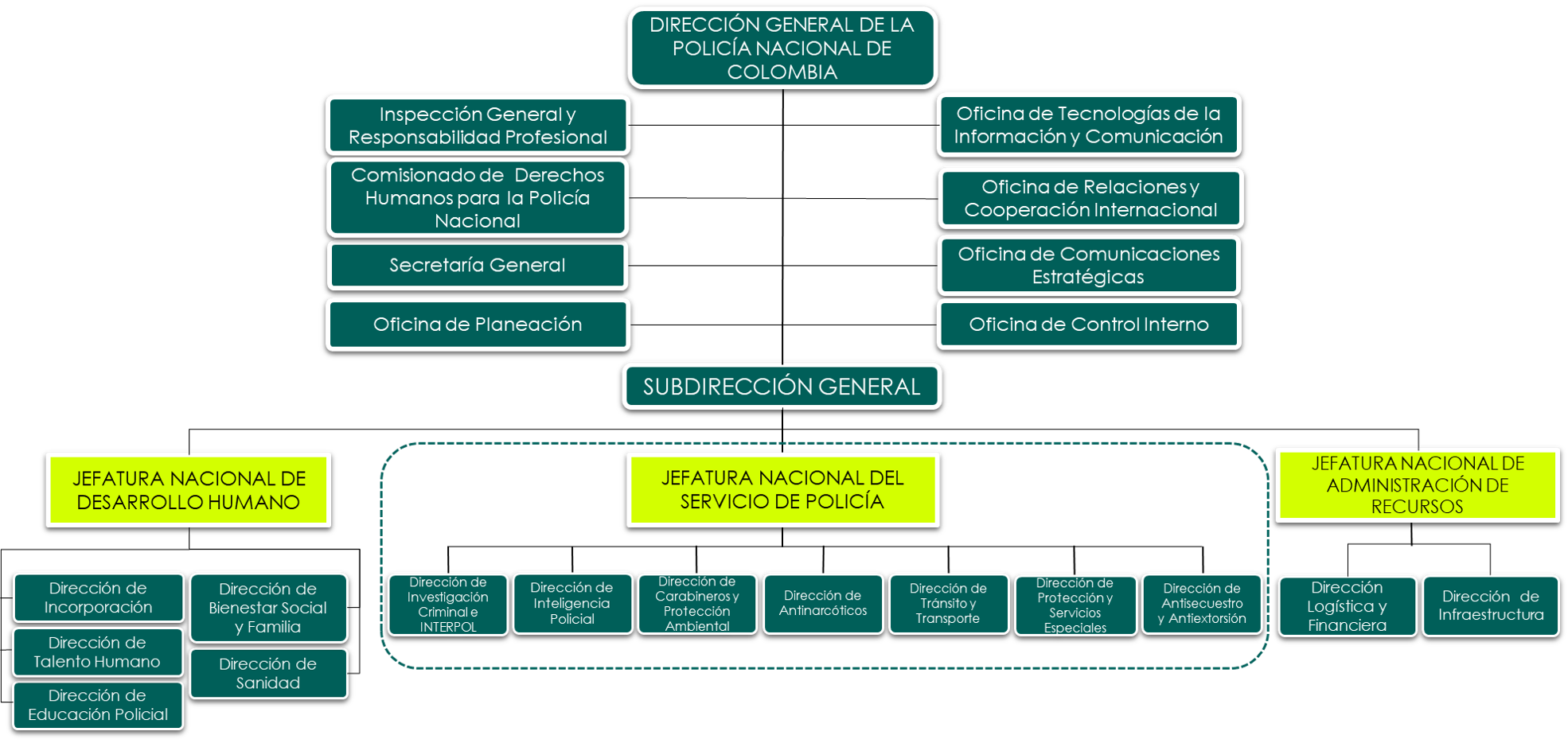 Está compuesto por dos circunferencias concéntricas en cuyo interior lleva una estrella de cinco puntas sobre la que se destaca como elemento principal, el Escudo Nacional de Colombia ratificando el valor de la Policía para la nación. El laurel que lo abraza, simboliza la victoria perenne que trae consigo la libertad; los 11 gules rojos representa el mes de noviembre y las cinco estrellas de color verde que separan los textos República de Colombia y Policía Nacional, simbolizan la prudencia, rigor y obediencia e indican el día de la fundación de la Policía Nacional de Colombia, es decir, el 5 de noviembre de 1891.