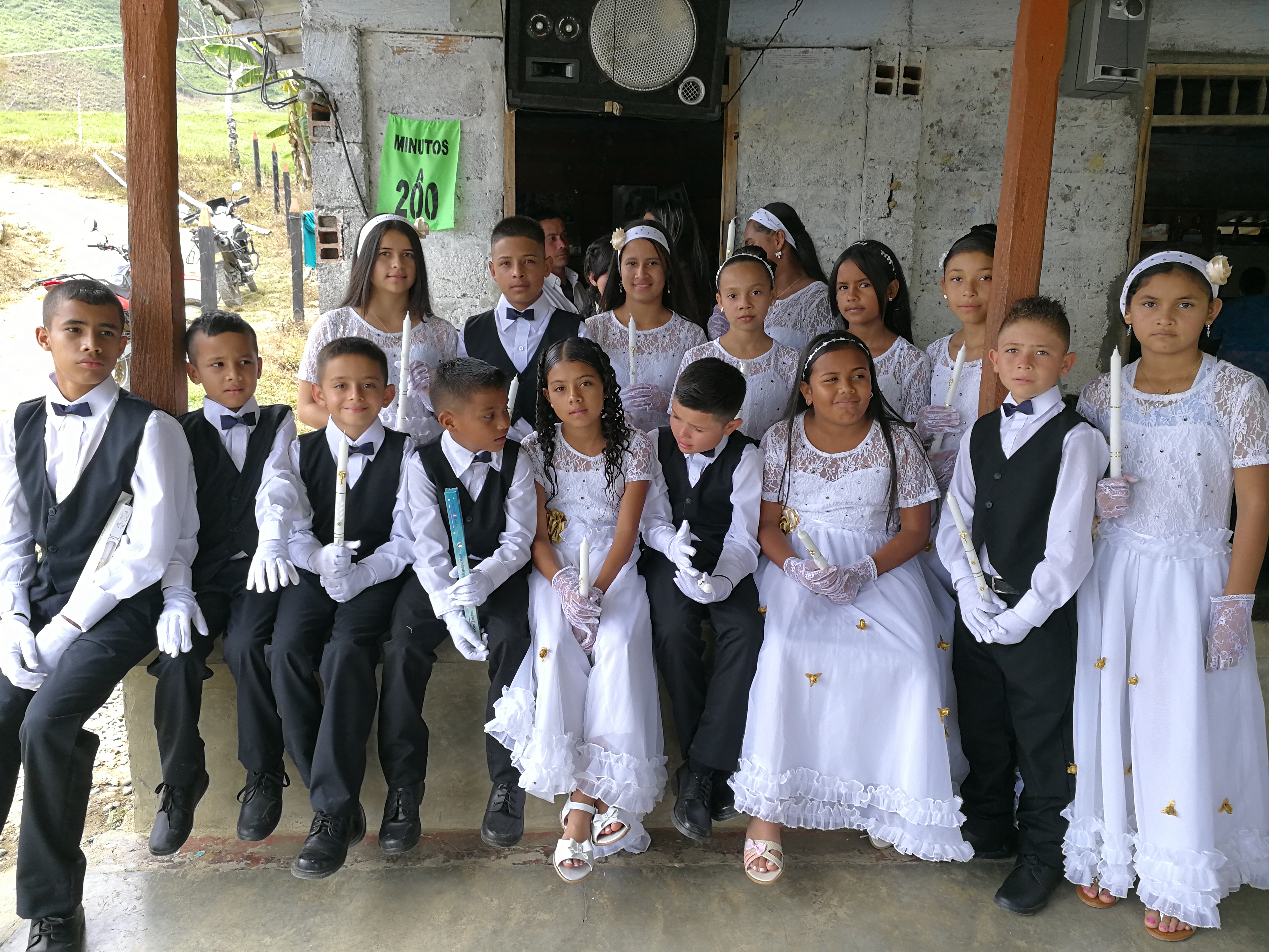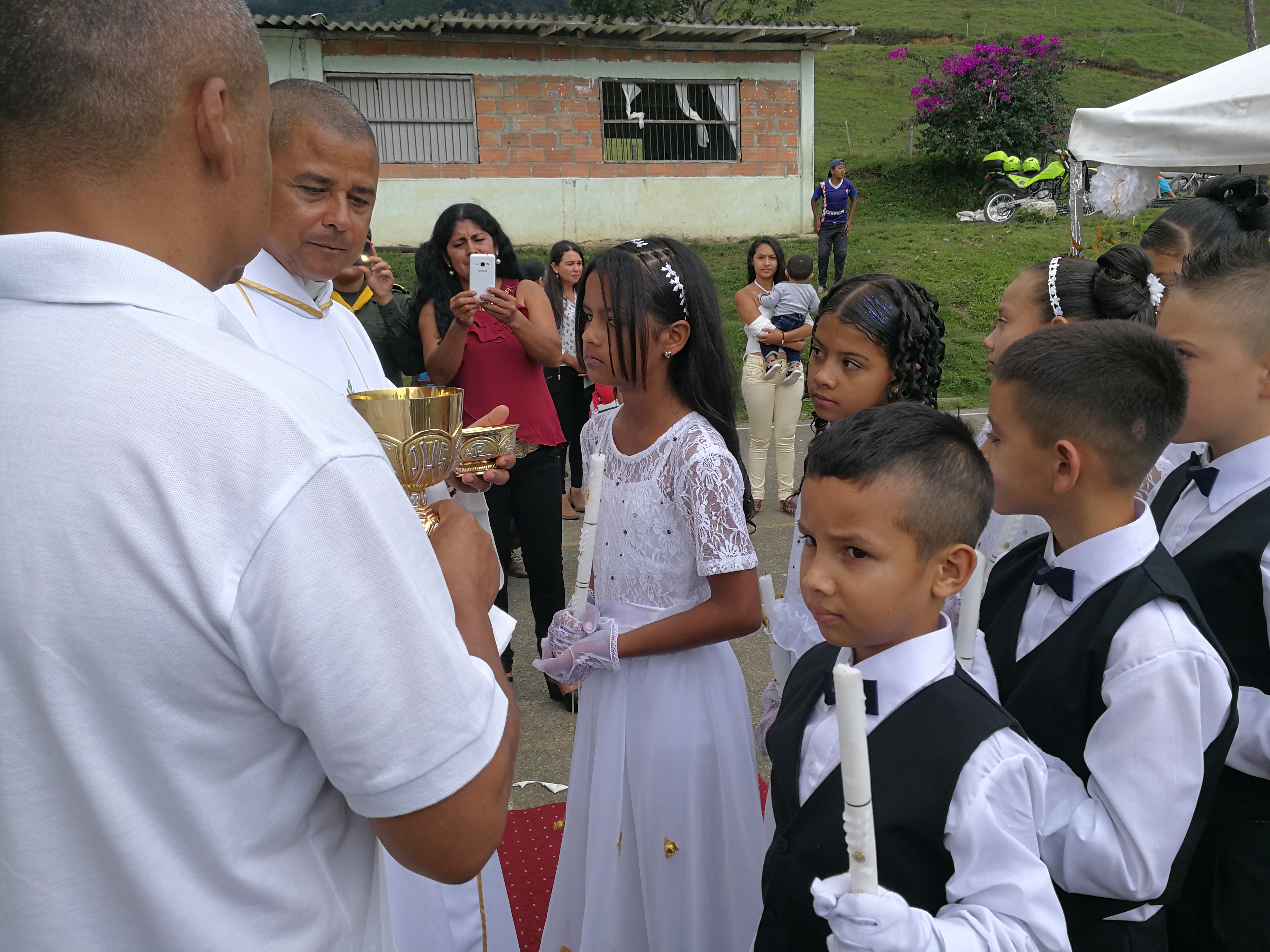 16 niños de esta vereda fueron preparados espiritual y académicamente para este día, las familias de estos niños no cuentan con recursos suficientes para realizar una pequeña ceremonia o simplemente para desplazarse hacia una zona urbana para poder asistir a la catequesis, por eso nuestra Subcomisario se dio a la tarea de cumplirle a estos pequeños para que este día se quede en sus corazones y sus recuerdos; esto la llevo a gestionar con varios comerciantes los atuendos que lucieron el día hoy para el recibimiento de Jesucristo en sus corazones por primera vez.