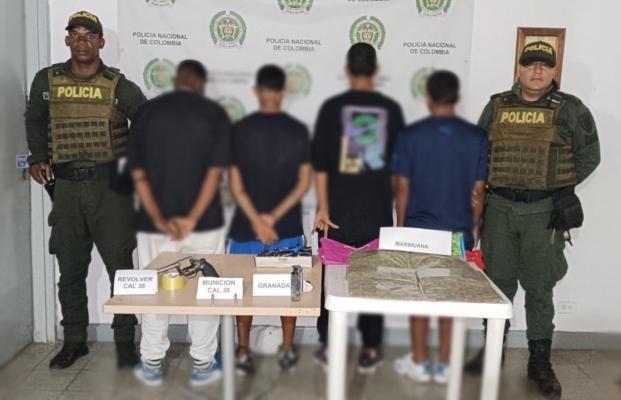 En el barrio Centro del municipio de Guacarí, fueron sorprendidos cuatro adolescentes a quienes se les halla en su poder un arma de fuego tipo revólver, 3 cartuchos, una granada, 1.600 gramos de marihuana y 3 dispositivos móviles.