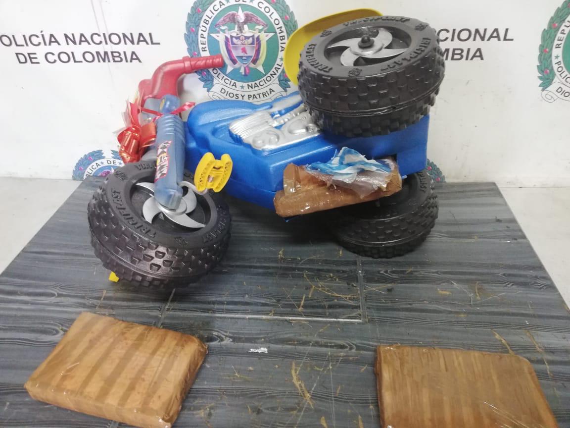 La Policía Nacional a través de la Dirección de Antinarcóticos impidió la salida de un juguete contaminado con marihuana, en horas de la mañana del día de hoy, las autoridades responsables de la inspección de la carga y las encomiendas que pasan por el aeropuerto internacional El Dorado de Bogotá, se percataron de este envío cuando sintieron que el triciclo pesaba más de lo normal.