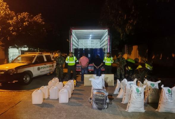 La Policía Nacional en el departamento del Meta, en el desarrollo de planes focalizados para contrarrestar los delitos, a través de la Seccional de Tránsito y Transporte Meta en conjunto con el Ejército Nacional, logra la captura en flagrancia de dos hombres de 45 y 50 años de edad, quienes transportaban 1.585 galones de insumos líquidos y 490 kilos de insumos solidos utilizados para el 50 años de edad, quienes transportaban 1.585 galones de insumos líquidos y 490 kilos de insumos sólidos utilizados para el procesamiento de narcóticos.
