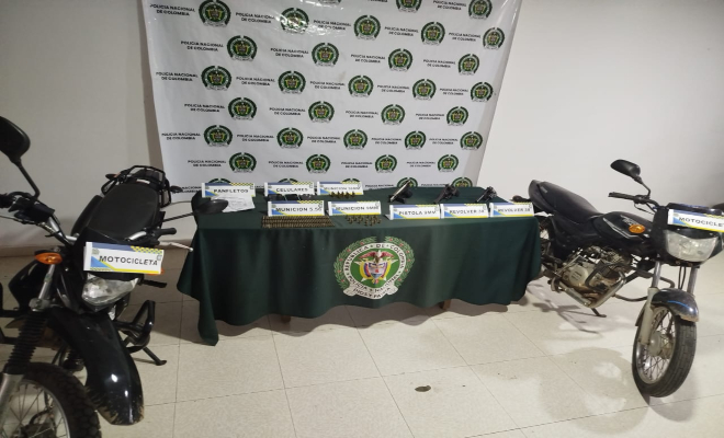 En el procedimiento les fueron incautados una pistola Smith & Wesson Cl 9 mm, dos revólver calibre 38, 16 cartuchos Cl 9 mm, un proveedor para pistola Cl 9 mm, 12 cartuchos Cl 38, 105 cartuchos 556 mm, tres celulares y dos motocicletas.