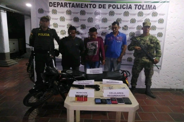 Es así como de inmediato se activa un operativo donde teniendo en cuenta que es zona rural se solicita apoyo a personal del Ejército Nacional, en el puente de la quebrada el vallecito, vereda Singapur vía al corregimiento Delicias, mediante información aportada por integrantes de las redes de participación cívica, se interceptan cuatro sujetos de 18, 39 y 47 años y un menor de 16 años, quienes se movilizaban en tres motocicletas, los cuales al momento de realizarle registro a personas se les halla en su poder dos pistolas de fogueo, cinco cartuchos para escopeta calibre 16mm, un cartucho para escopeta calibre 12mm, tres motocicletas color negro con azul y color negro, una de estas la que había sido hurtada, así como cinco celulares, uno de estos que había sido hurtado y $273.000 pesos en billetes de diferente denominación, siendo reconocidos por los afectados quienes llegan al lugar aún con las manos atadas con fibra, manifestando lo sucedido, siendo así capturados los tres sujetos y aprehendido el menor.