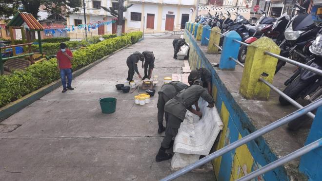 Uniformados y comunidad realizaron una jornada de ornato y embellecimiento al Parque Cuevas Leiva, con podas de césped, pintura de murales, barrido de parques, plantación de árboles y arbustos, ubicación de canecas de basura para reciclaje, entre otras actividades, dándoles un aire diferente, así mismo se realizó la entrega de elementos de bioseguridad y solicitud de antecedentes a transeúntes.