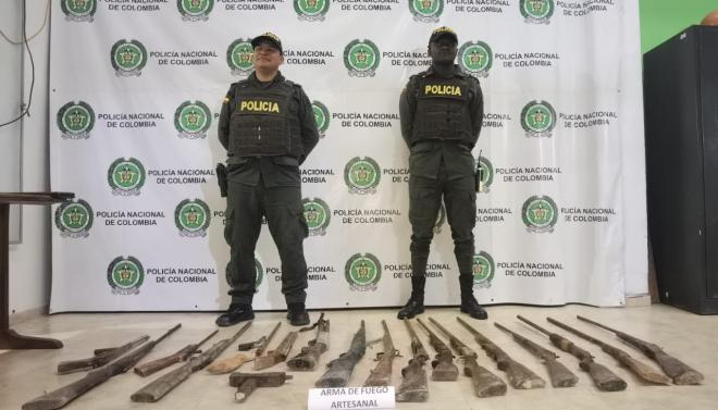 Mediante el desarrollo de planes de control y actividades de patrullaje sobre la vía que conduce al corregimiento de Remolino, zona rural del municipio de Policarpa, uniformados adscritos al Modelo Nacional de Vigilancia Comunitaria por Cuadrantes lograron el hallazgo de 17 armas de fuego tipo escopetas de fabricación artesanal y un mini uzi.
