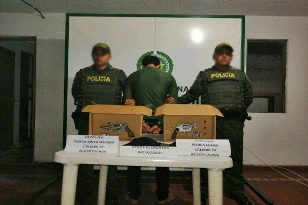 Es así como se activa un operativo logrando una reacción inmediata, siendo localizados los sujetos quienes al notar la presencia policial emprenden la huida donde en la reacción de los uniformados se logró la captura en flagrancia de un de estos de 26 años a quien se le hallo en su poder al interior de un saco color negro 01 pasamontañas y 01 arma de fuego tipo revolver calibre 38 corto, con 06 cartuchos para el mismo, avaluada $ 3.000.000, sin permiso para porte o tenencia.