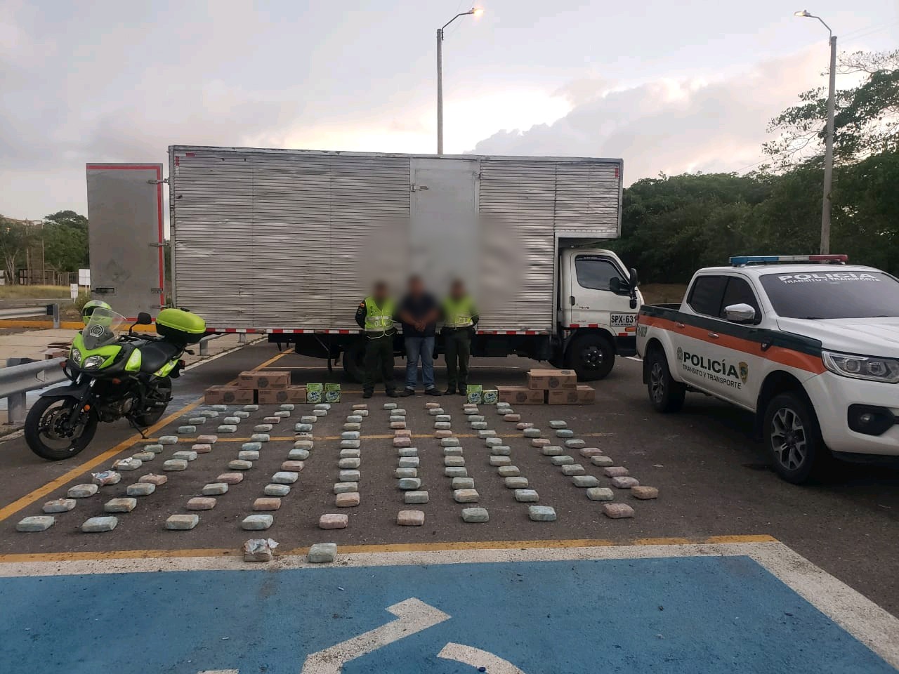 En el marco de la ofensiva nacional “Todos contra el narcotráfico” y en cumplimiento a él plan choque, “el que la hace la paga” Fase IV, “construyendo seguridad” la Policía Nacional en el Departamento de Bolívar, a través de efectivos de la seccional de tránsito y transporte, logró en las últimas horas la incautación de más de 58 kilos de marihuana prensada que eran transportadas en una camión tipo furgón y la captura del conductor que manifestó venir desde la ciudad de Cali y tener como destino final la Ciudad de Cartagena.