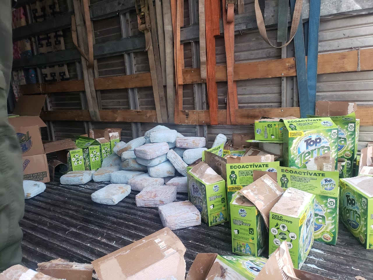 Los uniformados procedieron a efectuar el registro de rutina, abriendo la parte posterior del camión, y entre las encomiendas que transportaba la persona capturada, ubicaron 10 cajas de cartón que a simple vista pareciera ser jabón en polvo de la marca Top Terra.