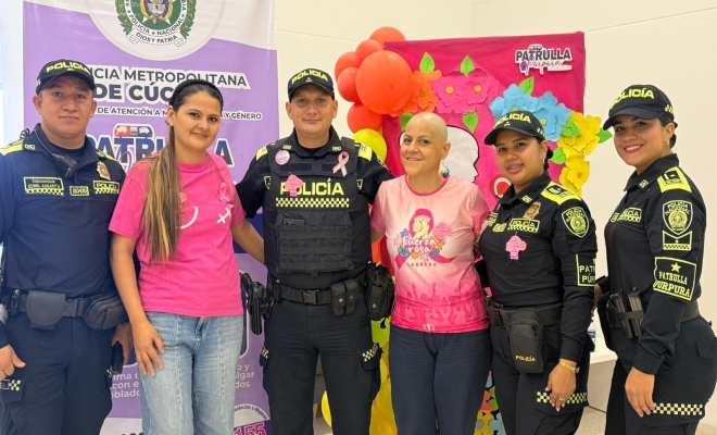 En el marco de la Estrategia de Atención a la Mujer, Familia y Género (EMFAG), la Policía Metropolitana de Cúcuta, a través del personal dinamizador de la Patrulla Púrpura, desarrolló una jornada de socialización dirigida a las integrantes de la Fundación Dimensión Rosa, conformada por mujeres valientes y sobrevivientes de cáncer, símbolo de fuerza, esperanza y resiliencia.