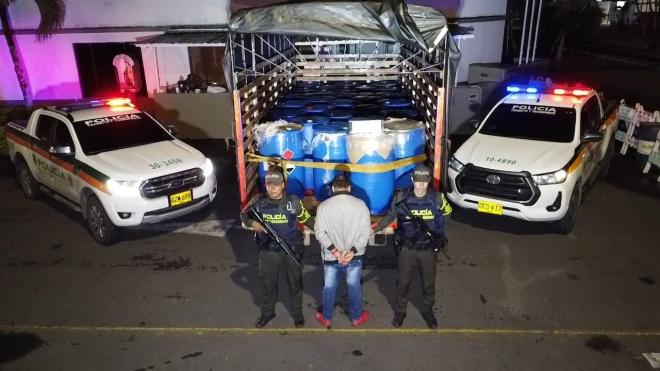Mediante actividades de registro y control a vehículos, sobre la vía Villarica que conduce al municipio de Palmira, kilometro 33, jurisdicción de Candelaria, el Departamento de Policía Valle, logró la captura en flagrancia de un hombre quien transportaba gran cantidad de sustancias para el procesamiento de narcóticos.