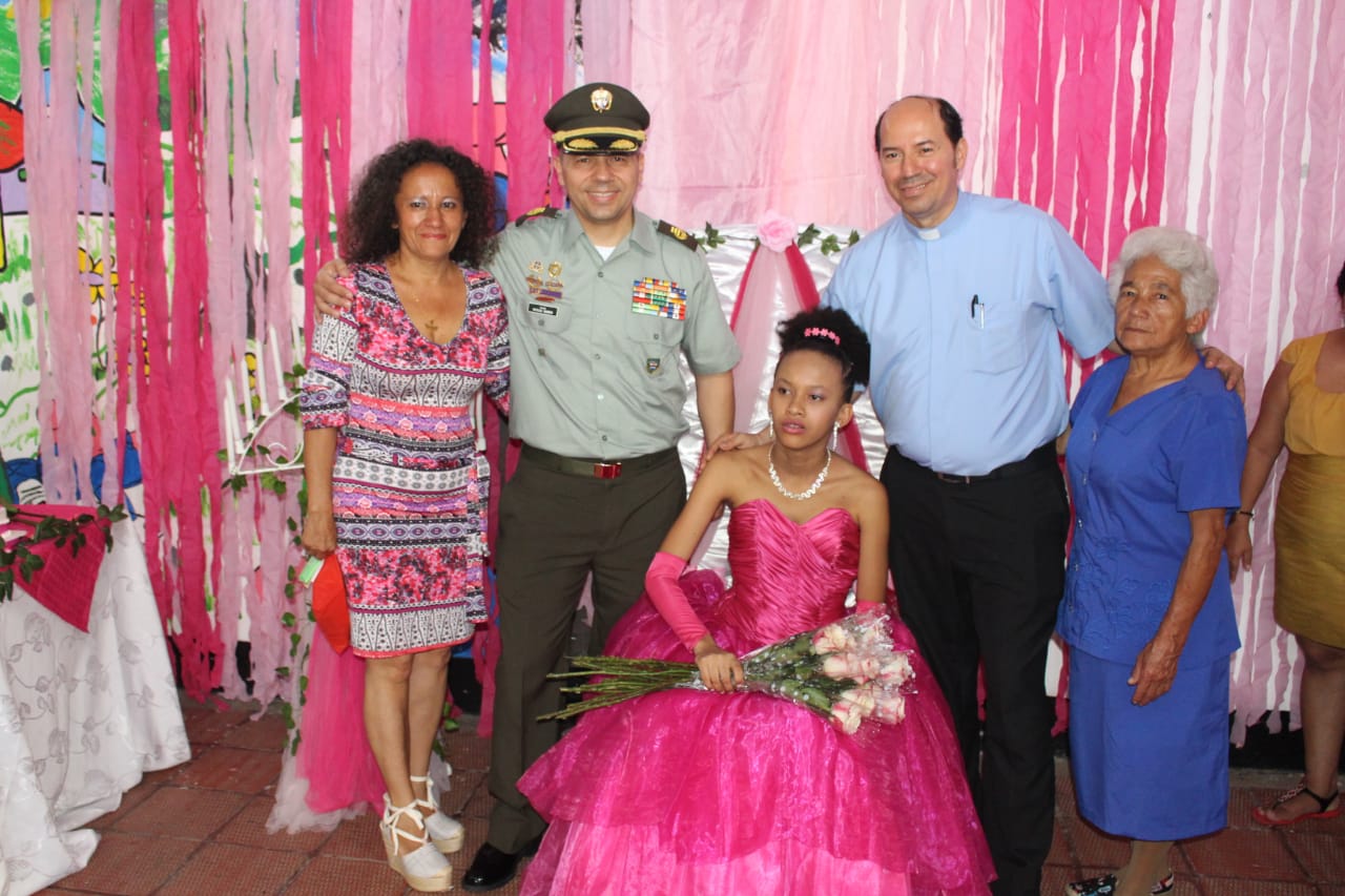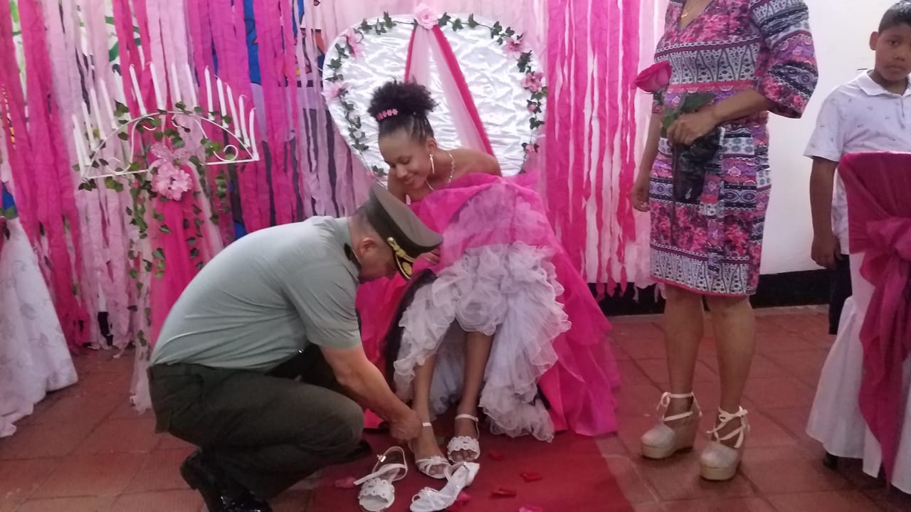 Este es el caso de Ana María, una adolescente que presenta capacidades diferentes, soñaba con una linda fiesta de 15 años, vestida con un traje rosa y acompañada por sus seres queridos, un sueño que para su progenitora la señora yanin Rueda, era casi imposible por lo que decidió tocar las puertas del Comando de la Policía Metropolitana de Ibagué, donde nuestro coronel Nicolás Carmen Aristizabal comandante de esta unidad, escuchó la historia y tocó su corazón, conmovido y sin pensarlo un instante decidió con su grupo de Prevención y Educación Ciudadana hacer realidad este sueño.