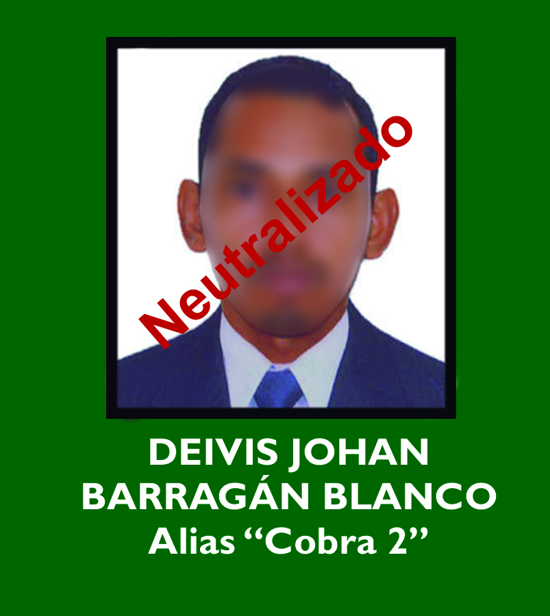 En la operación, infortunadamente perdieron la vida el soldado profesional Fernando Hernández Arrieta y el patrullero Jhon Rojas Colmenares, este último adscrito a la Dirección de Investigación Criminal e Interpol (DIJIN). “Lamentamos la muerte de dos héroes de la patria. Ofrendaron sus vidas liberando a Colombia de criminales como ‘Cobra 2’”, sostuvo el director de la DIJIN, general Jorge Luis Vargas Valencia.